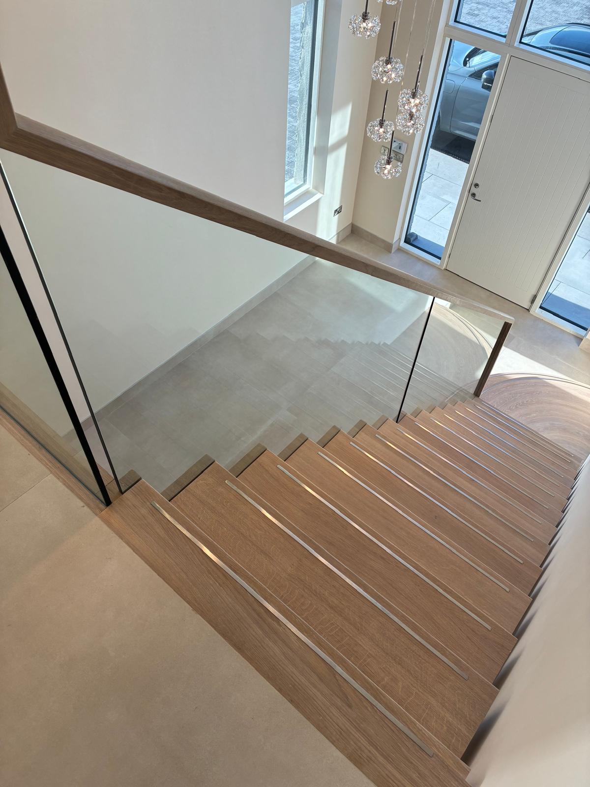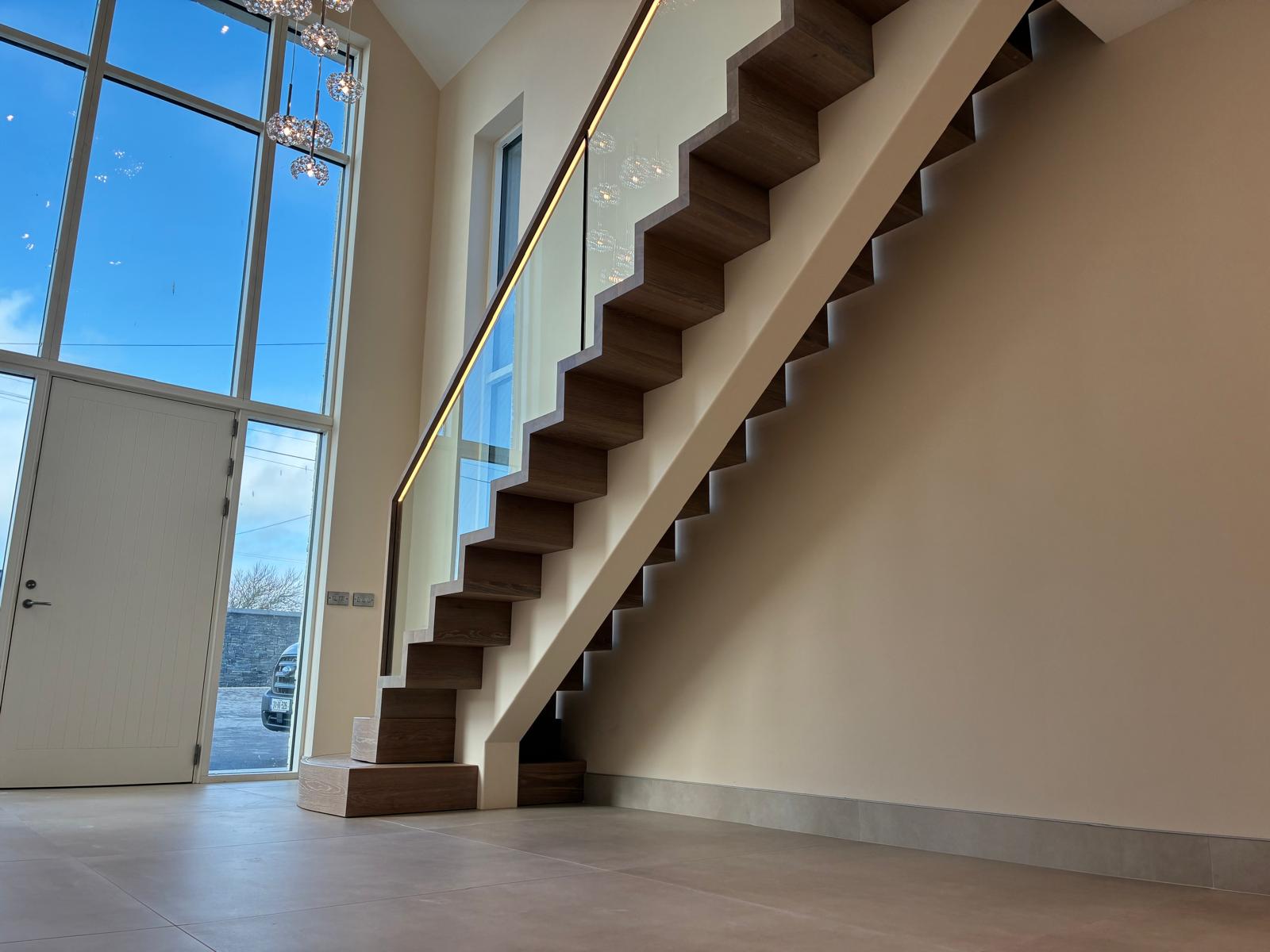 A custom mono-stringer staircase designed as a striking yet refined feature within a private home in Waterford. Combining painted steel, European oak, and glass detailing, the design balances clean architectural lines with natural warmth and modern craftsmanship.