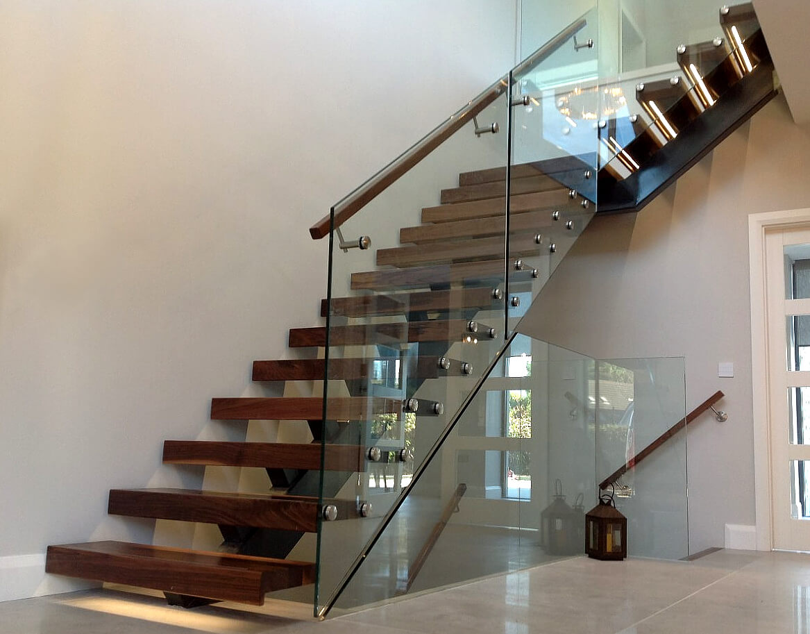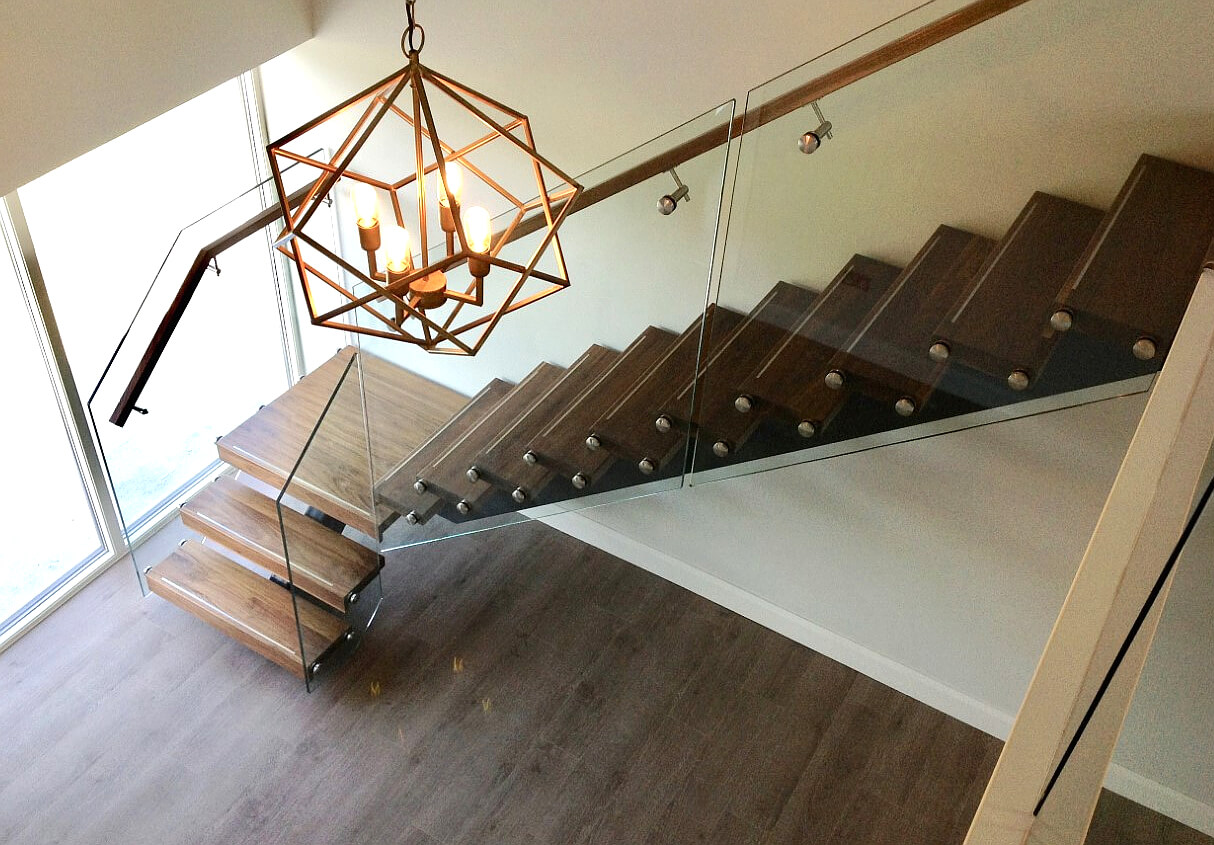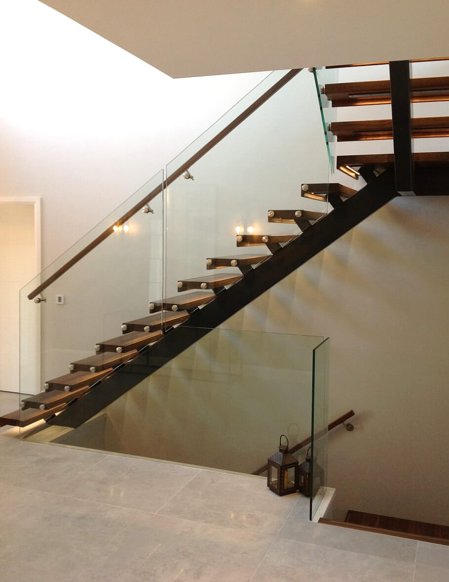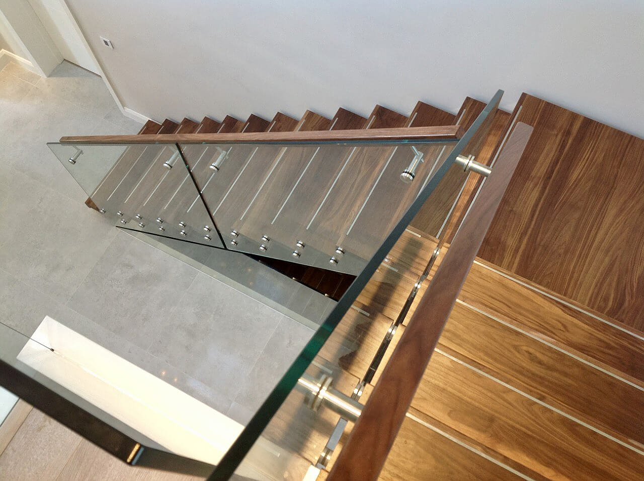 This premium staircase features an anthracite grey steel spine paired with American black walnut treads, stainless steel inlay, and a 15mm toughened glass balustrade secured with 45mm stainless steel retainers. A freestanding glass balustrade on the landing completes the modern aesthetic. Designed, manufactured, prefinished, and installed by AJD Stairs in Foxrock, Dublin, Ireland.