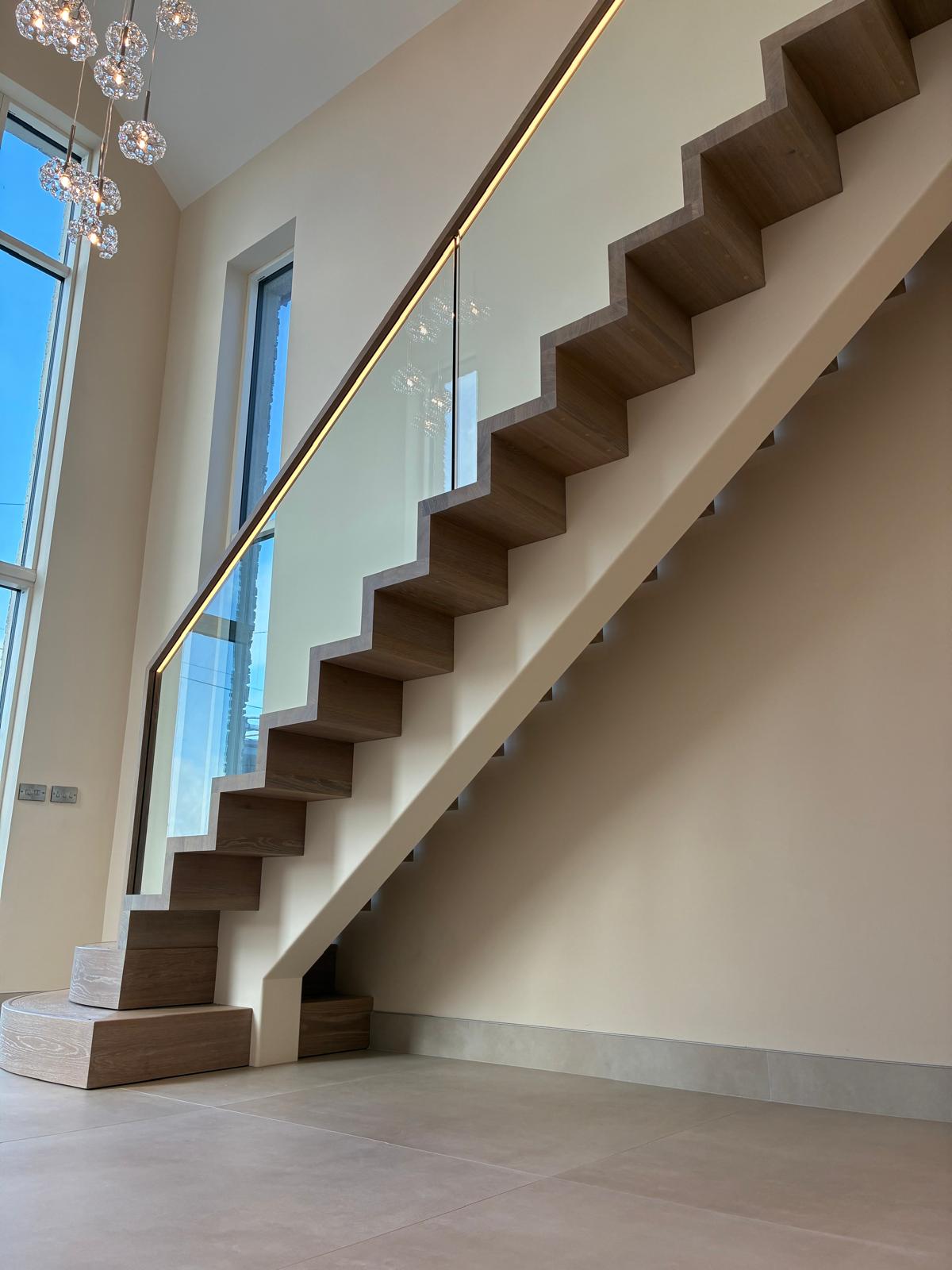 For the steel spine staircase, we use a specially designed and engineered central spine metal structure. The finished staircase is very durable and additionally resembles a piece of art. We angle our steel spine staircases according to the space allowed; thus turns are clearly distinguishable.