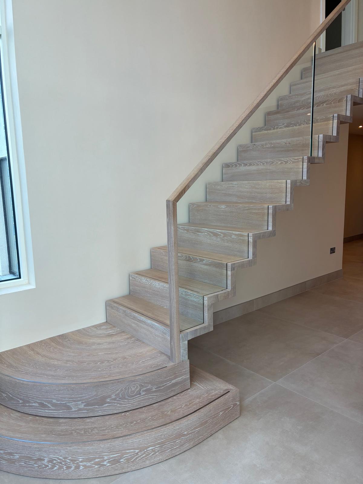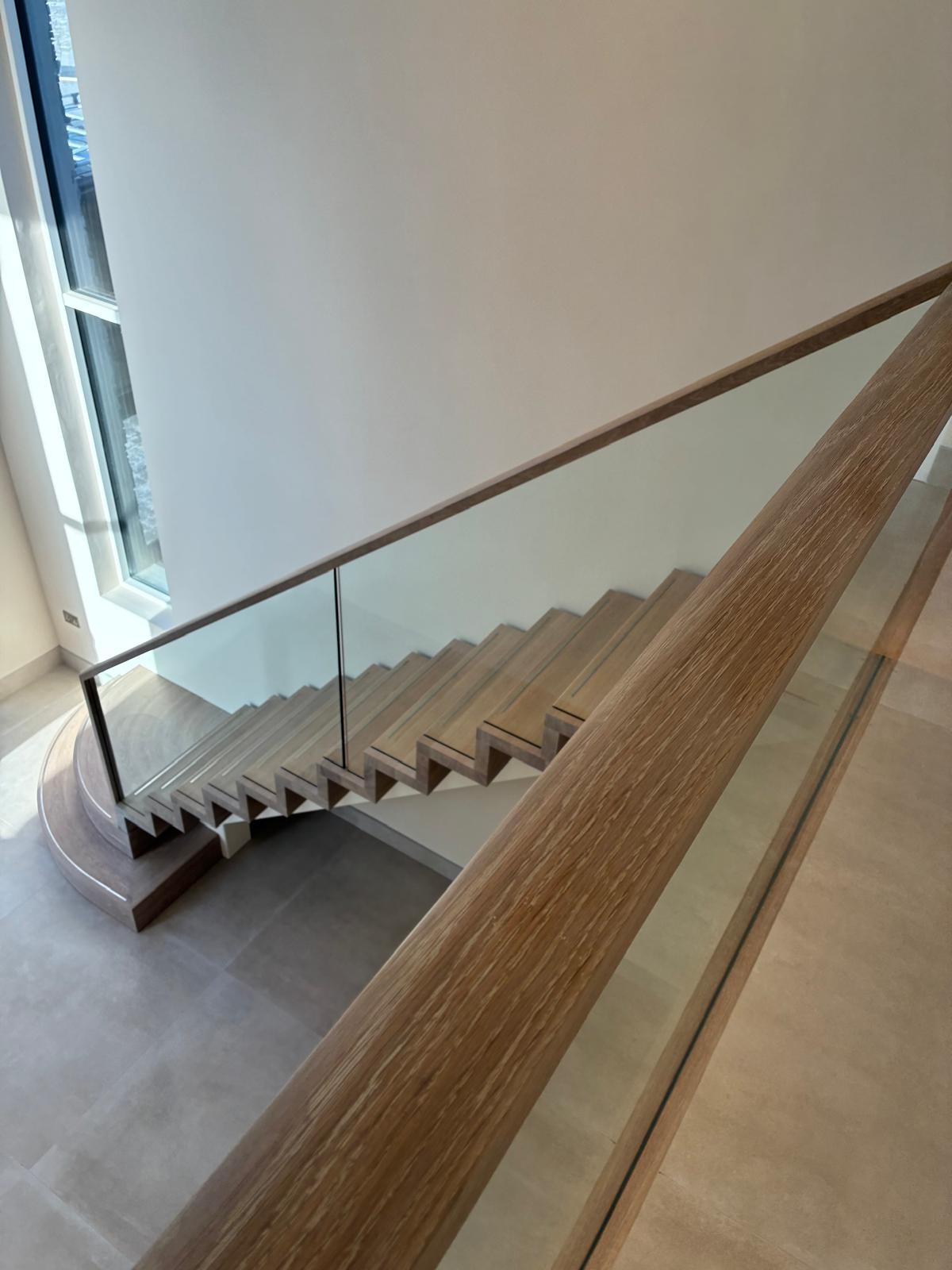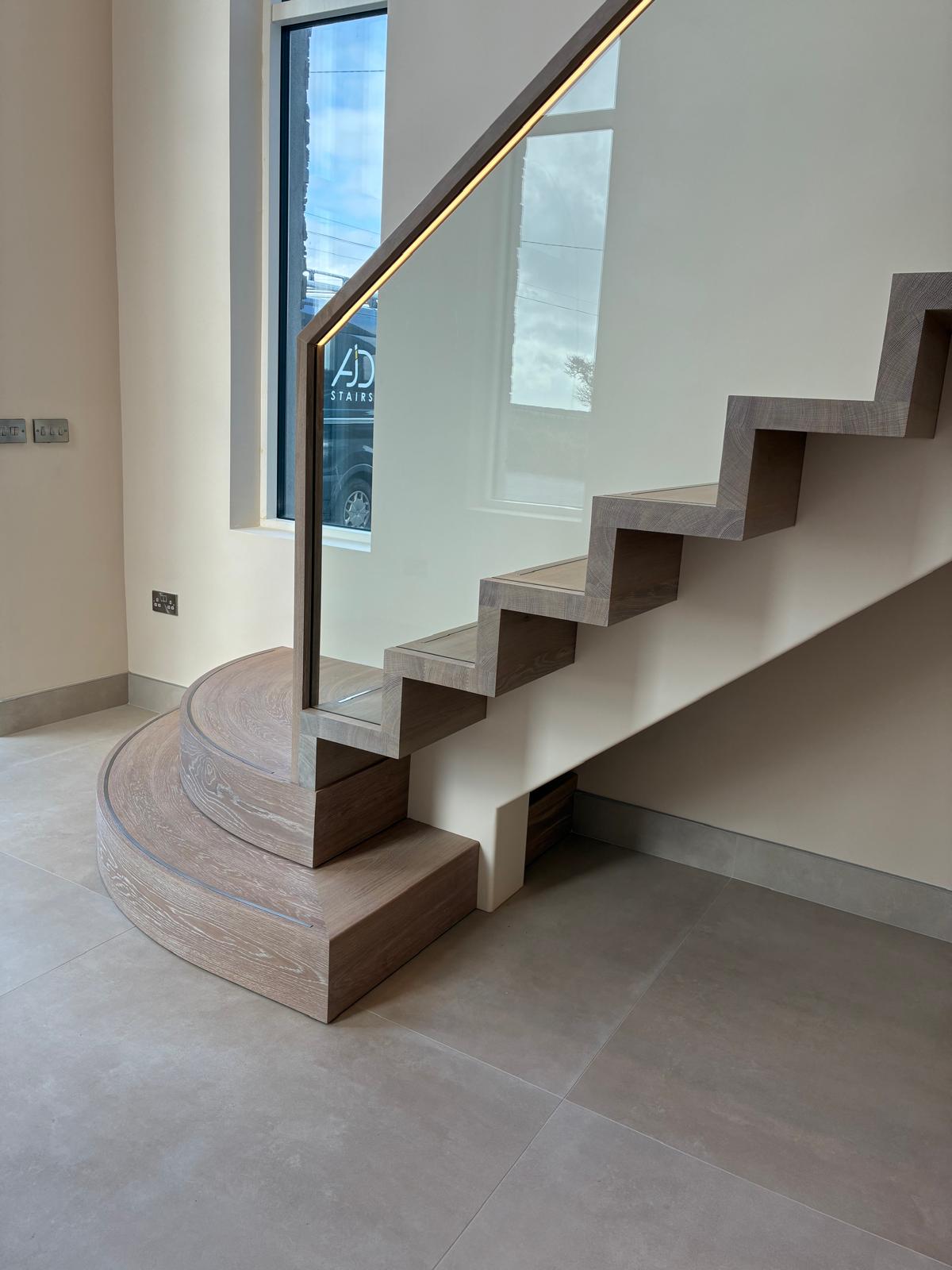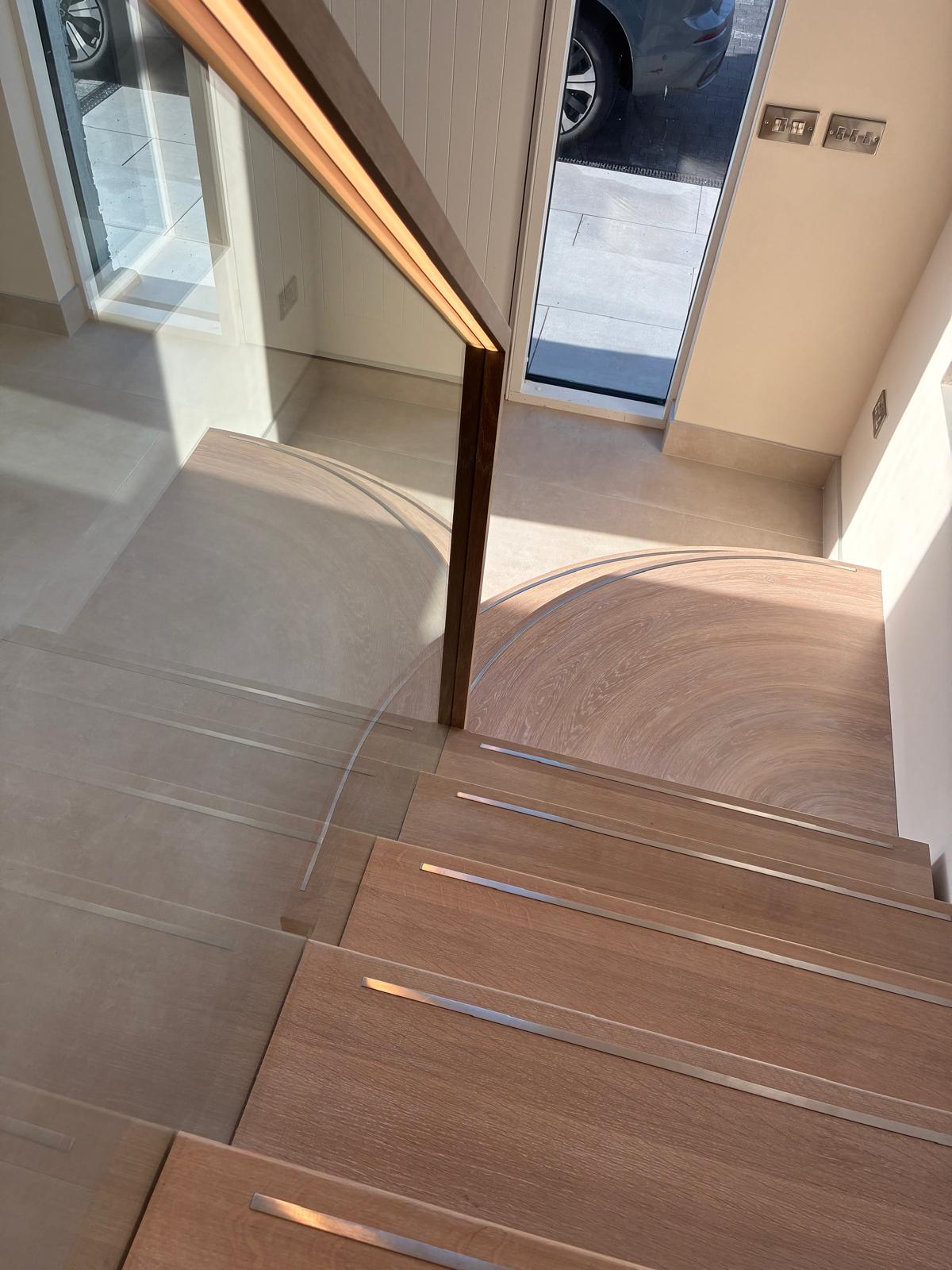 This bespoke mono stringer staircase is formed from painted steel and finished with prime European oak treads and risers. Stainless steel inlays introduce precision detail, while an inset glass balustrade maintains clarity and flow. An oak handrail with integrated LED lighting completes the composition. Designed and handcrafted as a refined architectural element within this private residence.