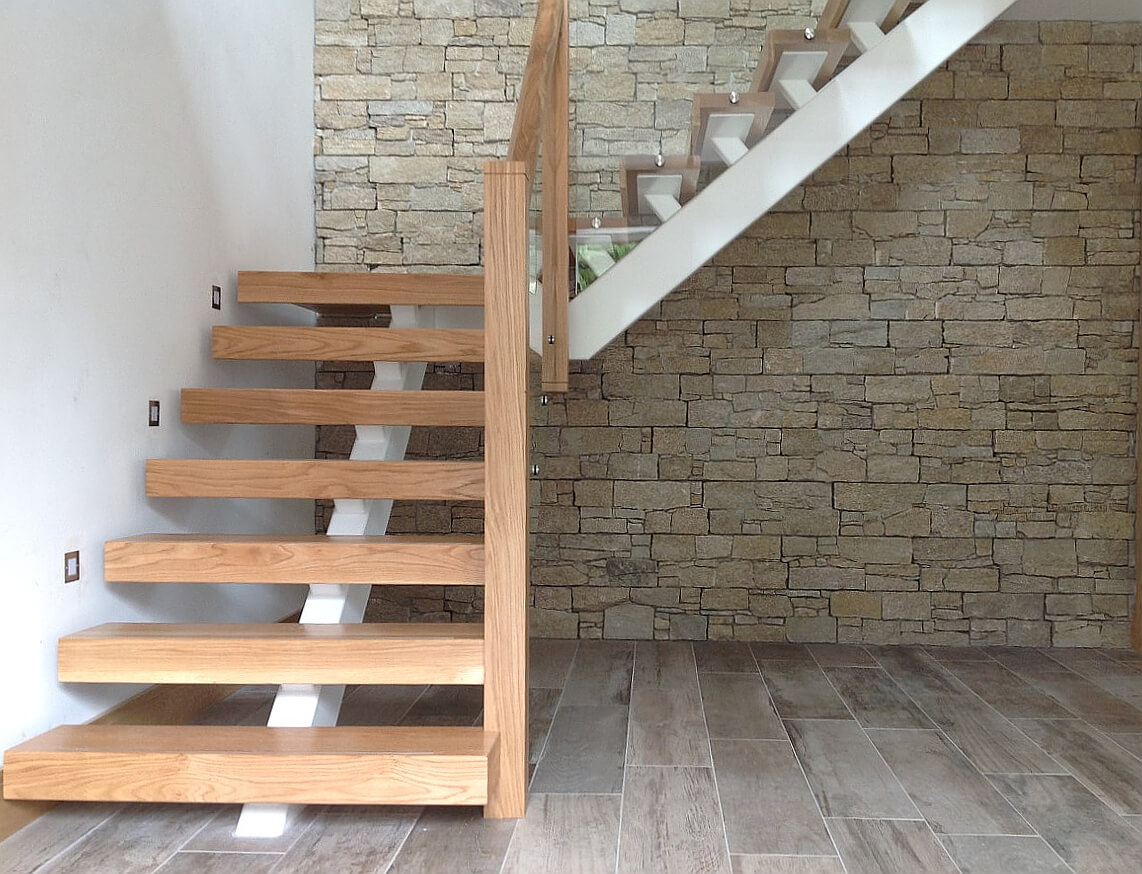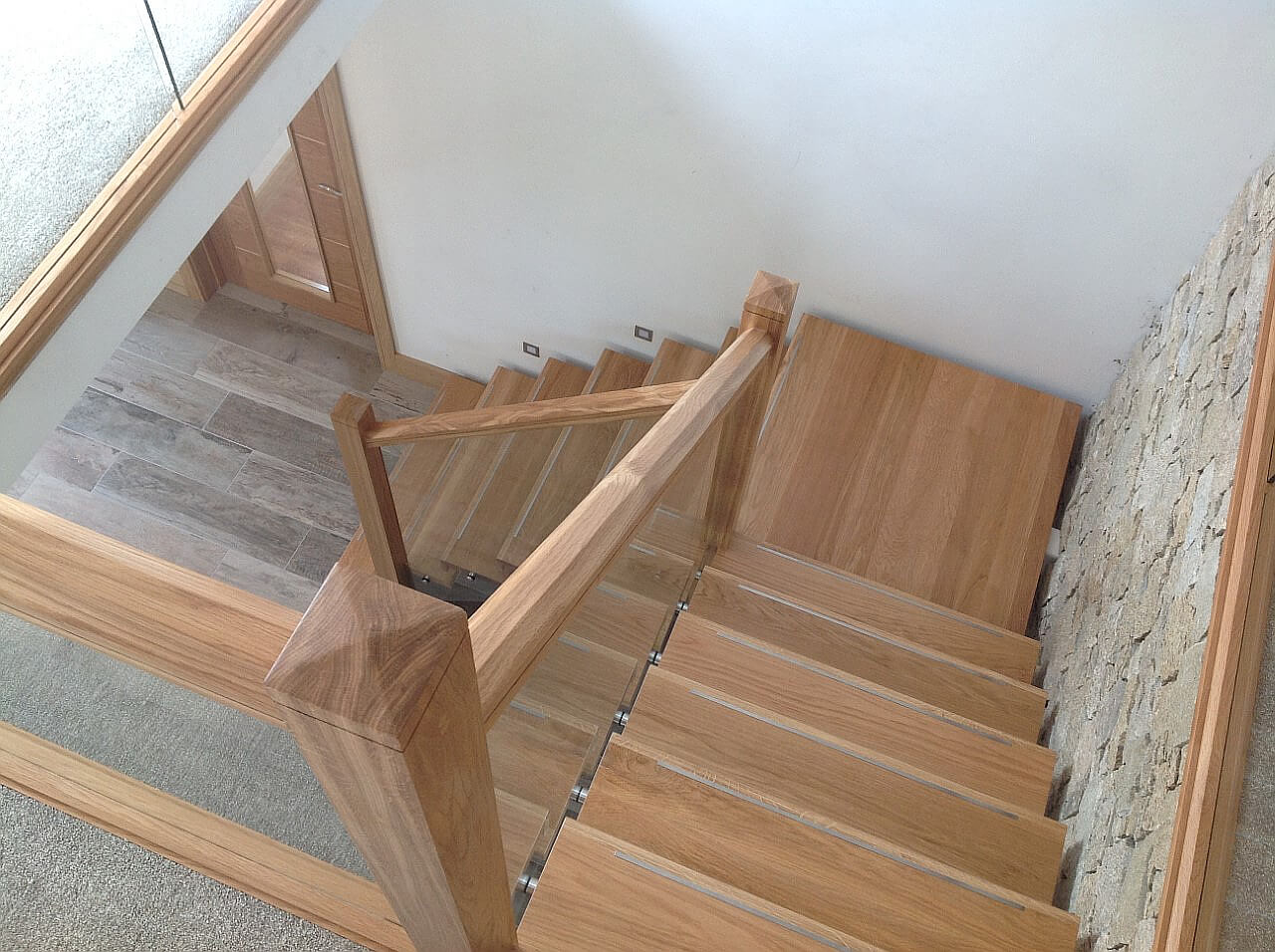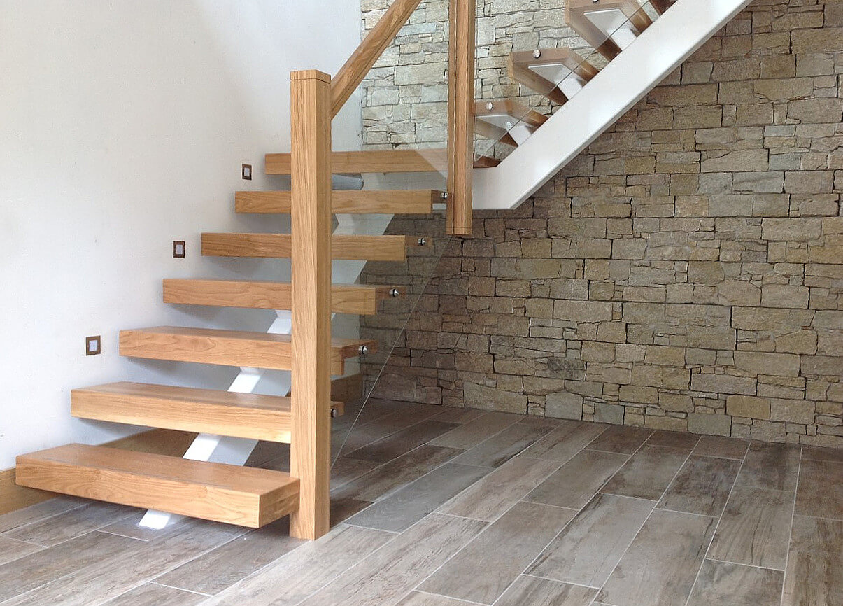 This modern white steel spine staircase features American oak treads with stainless steel inlay, inset LED lighting, and a toughened glass balustrade. Designed, manufactured, sprayed, and installed in Dunhill, Co. Waterford, Ireland, this bespoke staircase blends clean aesthetics with premium materials and expert execution.